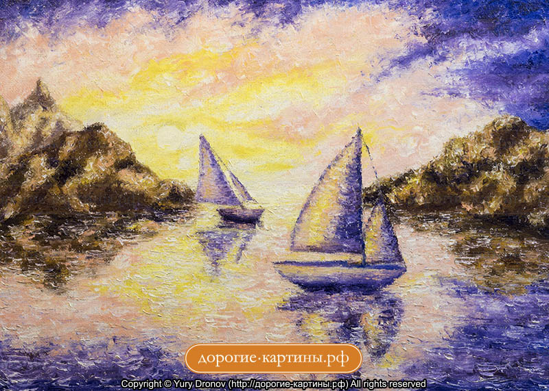 Эта картина создана в особом, неповторимом колорите. Филигранная авторская техника исполнения этого произведения современного искусства вызывает бурю чувств и приятных переживаний и воспоминаний Авторская инвестиционная картина. Рассматривать эту Картину можно как для инвестиций, так и для украшения интерьера. Рекомендуемая площадь помещения от 10 м2. Ключевые слова: картина, яхты, бухта, небо, горы, рассвет, солнце, море.